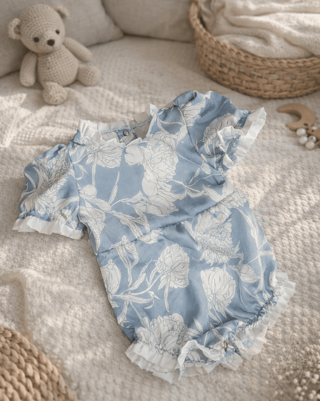 Dress your little one in timeless charm with our beautiful heritage floral linen romper in soft pastel blue and white. Crafted from breathable, lightweight linen, this romper is perfect for keeping your baby or toddler cool and comfortable all day long.